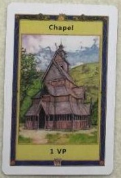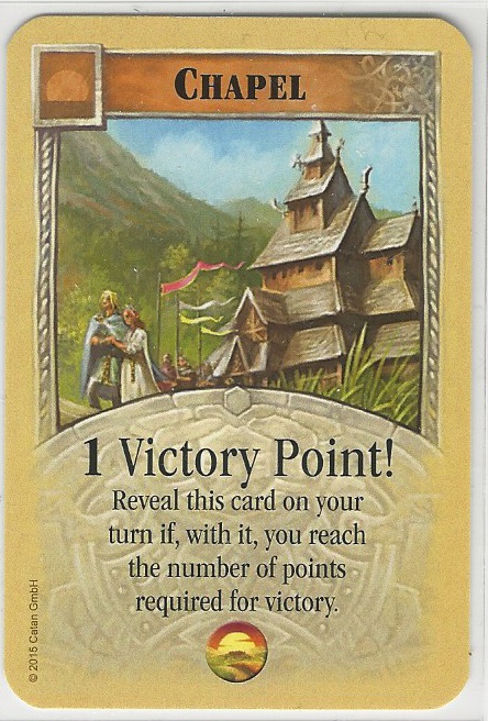 The base game of Catan has a development card called "Chapel." This valuable card is worth a victory point. If you happen to purchase this card, the Chapel may give you just enough victory points to win the game. Over the years, the Chapel has gone through a number of different design changes, as you can see below: